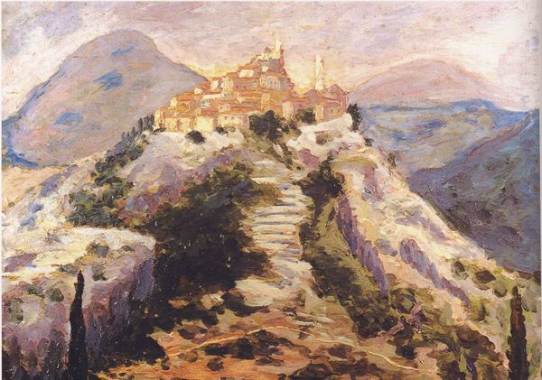 Curator: My first impression is the sheer romance of the scene. It feels bathed in a kind of hopeful melancholy, like a memory shimmering at the edge of a dream. Editor: We’re looking at "Sunrise, Mission at Pala near San Luis Rey," an oil on canvas completed around 1898 by Benjamin Brown. It’s an exceptional example of California Impressionism, depicting the historic Mission San Antonio de Pala, a crucial site in the colonial history of Southern California. Curator: Absolutely, and you can feel that history woven into the landscape, but almost…sublimated by the light. The palette, those muted golds and purples, feels almost like a whispered prayer. It's as though the land itself is exhaling the past. Editor: Indeed. But we can’t ignore the problematic layers beneath the picturesque. Missions were instruments of forced conversion and cultural erasure, sites of profound violence against indigenous populations. So while Brown’s painting is undeniably beautiful, its beauty obscures a complex and painful history. The light isn’t just innocent; it carries a burden of colonial legacy. Curator: It’s true, the brushstrokes are so loose and inviting, yet when you factor in the missions' function within the imperial agenda it’s hard not to wrestle with what feels like visual exploitation...Like gilding a bitter pill. Editor: Brown's decision to focus on the landscape, rather than the people affected by the mission, speaks volumes, too, reinforcing the erasure. It transforms a place of exploitation into a scenic vista, devoid of its historical actors and injustices. What looks at first to be a romantic, sweeping portrayal of an untouched and pristine mission and valley is an oversimplified reality that we need to examine and interpret. Curator: So, do you think there is a place for artwork like this today, in an age where historical narratives must also highlight trauma? Is it even ethical to create paintings that intentionally distract from tragedy? Editor: That is precisely why its presence and recognition are of utmost importance today! This and every form of visual art, that depicts tragedy and oppression, compels conversation. It fosters awareness, enabling the observer to form an interpretation that could lead to an open acknowledgment and recognition of these social injustices. Curator: Hmmm, well, there you have it, maybe it's less about guilt, and more about active observation. It calls for an ongoing discussion between truth, light, darkness and legacy. Thank you. Editor: And thank you.