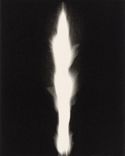 Curator: The atmosphere is so heavy, like a storm gathering just over the horizon. There's a vulnerability suggested by the isolated figure, and yet also a strange strength. Editor: This piece, titled "Moby Dick," is a print, drawing, made with graphite and charcoal on toned paper, dating from around 1974 by the artist David Freed. Curator: The title immediately frames it within a certain socio-political lens, doesn't it? Melville's novel itself a dense exploration of American identity, ambition, and the destructiveness of unchecked obsession. Given the time period, post-Vietnam, it almost screams about lost idealism. Editor: Exactly. But the abstraction pulls away from direct narrative, wouldn't you say? Freed was working in an era grappling with legacies of abstract expressionism and its challenge to the societal role of art. Notice how he plays with light and shadow. It's not merely illustrative but actively constructs the mood, drawing us into Ahab's psyche. Curator: The formal elements enhance the reading of obsession and alienation. The figure is dwarfed. The stark light, almost violently illuminating, becomes another isolating factor. We see it as if cast onto the wall of Plato’s Cave. And what are those geometric shapes below? There seems to be some indication of a boat too, within those angular forms, and maybe more triangular forms, like sails…It suggests the futility of trying to chart something fundamentally unknowable. Editor: Interesting point. You know, during the '70s, institutions were expanding their engagement with artists like Freed, broadening definitions and visibility for contemporary American art and how political narratives were embedded in it. This was not an easily accepted or digested work at the time for audiences or critics. It pushes the boundaries of conventional political commentary into more psychologically resonant territory. Curator: Perhaps what makes "Moby Dick" so effective is how it marries formal abstraction with complex themes related to the socio-cultural milieu of the artist. The individual's fraught relationship with nature, perhaps representative of power structures is still resonant for audiences today. Editor: Precisely. Freed manages to engage history while probing the depths of the human condition and still raising timely questions about contemporary society.