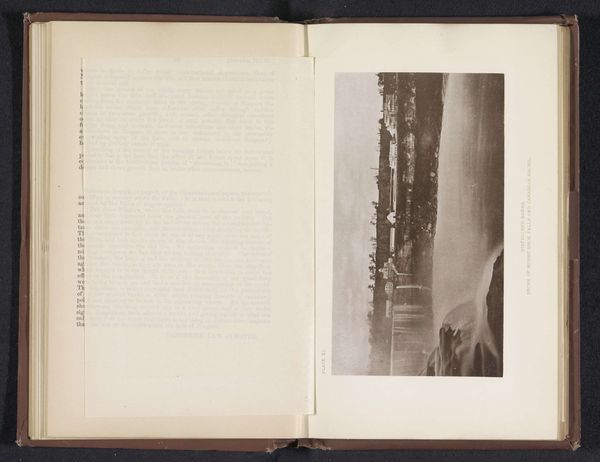 Editor: So this photograph, "Landschap met bomen," dating from before 1902 and created by Ph. et E. Link, shows a landscape within the pages of a book. It's quite atmospheric, with the dark trees contrasting against the lighter sky. What do you see in this piece, considering the visual symbolism? Curator: This image speaks volumes about the relationship between art, nature, and memory. Note the stark, almost silhouette-like depiction of the trees. What emotions do you think these skeletal trees evoke against the cloudy sky? Is it melancholy, or perhaps resilience? Editor: It's definitely got a sombre feeling. The starkness and the grey tones evoke a sense of stillness and perhaps a hint of isolation. The title in French also seems out of place, giving off conflicting memories and experiences. Curator: Exactly! Consider how this image, bound within a book, becomes a cultural artifact itself. The "thick" or "historical font" someone may find in the full book carries the weight of the past. It almost creates a sacred space. Does it make you reflect on a particular memory of a landscape? The printed page almost becomes a memory palace containing images, where you associate words and visuals with something personally important. Editor: That’s a very interesting idea! It does make me think about how we often find comfort or understanding through the act of reading about or viewing nature, rather than being directly in it. What do you think the artist might have wanted us to feel? Curator: Perhaps they intended to capture that precise tension, the interplay between our direct experiences and the mediated representations of the world. It can remind us that images can encapsulate emotion, history and cultural memory more potently than simple observation. Editor: This has given me so much to think about – how the format of the image itself impacts our interpretation of the landscape within. Curator: Indeed. Hopefully, you understand the power of symbolism, context, and individual interpretation in art!