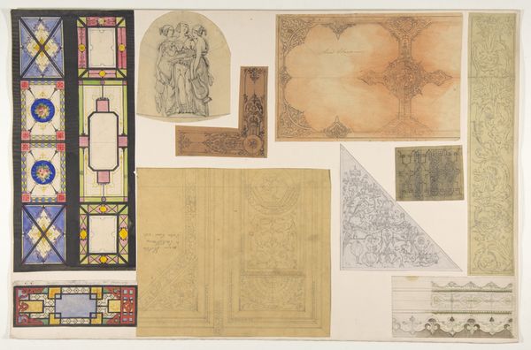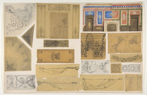 Curator: Here we have "Eight Designs of the Ornamentation of Ceilings and Walls, Probably for the Duc de Mouchy" dating from around 1850-1900 by Jules-Edmond-Charles Lachaise, currently residing at the Metropolitan Museum of Art. It incorporates drawing, print, and etching on paper. Editor: My immediate impression is one of architectural drafting combined with a decorative sensibility. I'm seeing intricate ornamentation, very evocative of French aristocracy, almost like dress patterns made large. Curator: Indeed, these preparatory drawings showcase Lachaise’s engagement with architectural decoration during the height of lavish aristocratic commissions. The Duke de Mouchy connection places this work firmly within a specific social and economic context of that period. Editor: It's intriguing to consider the material labor involved. Look at the varied papers, the different pencils, and the process of etching replicated on each sheet. We see the marks of both architectural precision and artistic freehand—a collaboration if you will between intention and materiality. It begs the question, to what extent did those materials available dictate the nature of this final decorative scheme? Curator: I think it would be insightful to consider these designs not just as mere drawings but also to situate them within the grander narrative of 19th-century French societal dynamics. Think of the political implications inherent in adorning the homes of the elite while the working classes lived in stark contrast. How did the production and consumption of luxury impact social hierarchies? Editor: Absolutely, the creation and availability of these pieces for the aristocratic consumer also highlights the underappreciated skill required for mass production, to take individual elements like floral swags, corner-pieces and wall friezes, and to efficiently reproduce them for wide deployment into these homes. Each one an assertion of status made available through an expanded, and evolving system of labor. Curator: Seeing how architectural designs become cultural artifacts also opens doors for us to consider how history shapes aesthetics. This approach isn’t simply about appreciating design; rather, it’s about understanding the political and cultural messages conveyed. Editor: I agree! Reflecting on the design’s material presence reveals a nexus where social history meets the story of labor, inviting us to see art and design as inherently part of broader socio-economic structures.