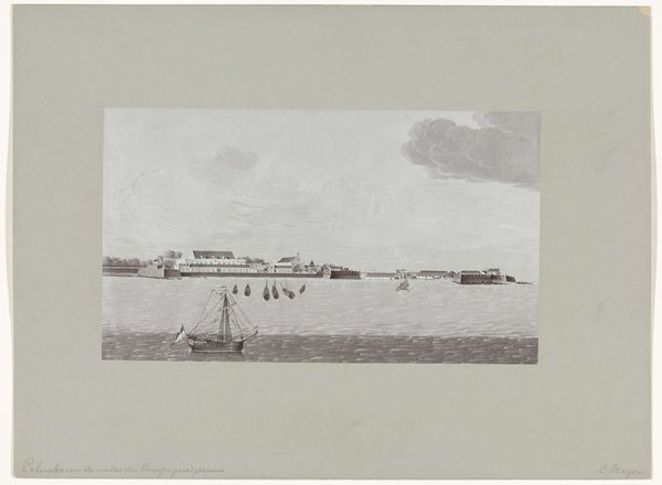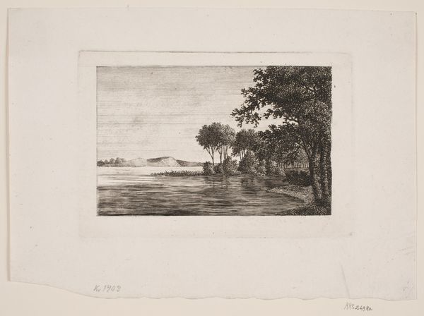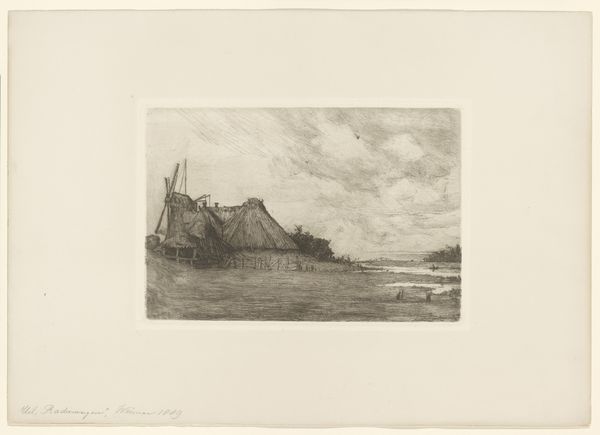 This is "Veerpont," an etching by Heinrich Ludwig Freiherr von Gleichen-Russwurm. The landscape is composed of a neutral palette, and a subtle interplay of light and shadow. The artist uses the etching technique to create a sense of atmospheric perspective. The composition is divided horizontally, with the lower half dominated by the water and the upper half by the sky and distant land. Notice how the ferry serves as a focal point, a vessel connecting different states of being. The sky, rendered with dense and chaotic lines, contrasts with the smooth water surface, creating a dynamic tension between the ethereal and the material. The artist disrupts the traditional landscape conventions. The artwork invites us to reflect on the transient nature of existence and the constant flux between stability and change. The landscape captures a fleeting moment in time.