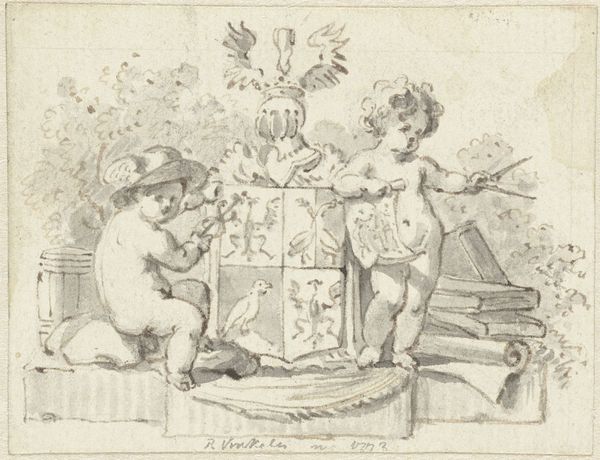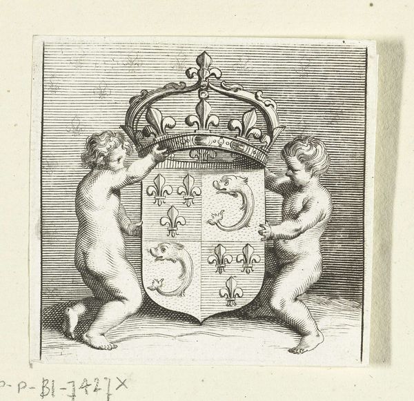 This print, made in 1773 by Reinier Vinkeles, depicts two cherubic figures flanking the Schoemaker family crest. Vinkeles worked during a time of social and political upheaval, as Enlightenment ideals began to challenge the established hierarchies of European society. Heraldry, like that displayed on this crest, was an integral part of aristocratic identity. Coats of arms weren't just decorative; they were powerful symbols of lineage, status, and privilege. This imagery reinforced social boundaries, often excluding women and those not part of the nobility. The putti, or cherubs, often symbolize innocence and divine favor. Yet, here they are intertwined with symbols of earthly power, and instruments associated with medicine and trade. The image encapsulates the complex interplay between tradition, religion, and emerging bourgeois values in the 18th century. It makes you wonder, who gets to write their history, and whose stories are left out?