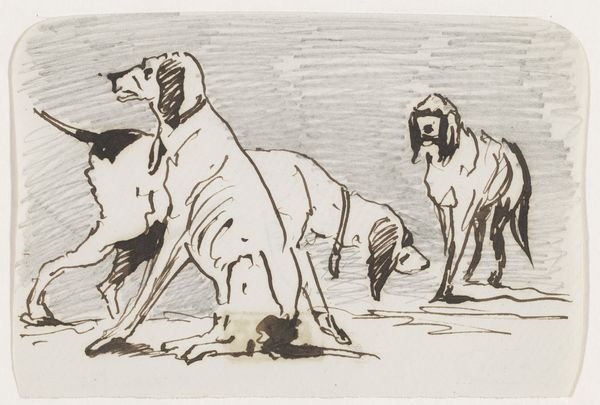 Johannes Tavenraat made this study of two horses using pen in brown and brush in gray, on blue paper. Tavenraat lived through a tumultuous period in European history, witnessing the rise and fall of Napoleon, and the social transformations of the Industrial Revolution. During the 19th century, the horse was not only an essential animal for transportation, agriculture, and warfare but also a potent symbol of power, freedom, and virility. The way Tavenraat captures the animal in motion, full of muscular tension, lends it a masculine aesthetic, emblematic of the era's fascination with strength and dynamism. The use of quick, expressive lines conveys a sense of immediacy, as if he is trying to capture the fleeting essence of these creatures. This piece invites us to reflect on the shifting roles and representations of animals in society, and how they mirror our own values and aspirations.