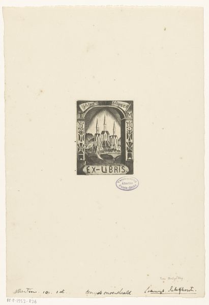 Editor: This is an interesting bookplate. It’s titled "Ex Libris van J.C.A. Oskam," made in 1915 by Lodewijk Schelfhout. It seems to be a print made with engraving and ink on paper. It's tiny but it feels really weighty, almost like a miniature gothic cathedral, perhaps! What strikes you most about it? Curator: Ah, yes, a little monument to learning! You nailed it with the gothic cathedral vibe; that pointed arch is no accident. It's a deeply symbolic choice reflecting not just medievalism, which was a big trend then, but also the weight of knowledge. Notice how the cathedral towers rise from the pages of the open book, a kind of fusion of sacred space and the printed word. What do you think the chess pieces guarding the book suggest? Editor: That's so interesting! The cathedral seemed obvious in retrospect, but I love your take on its symbolic significance. And I hadn’t really considered the chess pieces – are they about defending knowledge or something? Curator: Possibly! Or maybe they are a quiet meditation on strategy, thoughtfulness and the game of understanding. Perhaps Oskam, the book's owner, saw himself as a player in the world of ideas? The use of line, creating these crisp geometric forms, gives it a very solid, almost architectural feel, doesn't it? And the "Ex Libris" inscription itself— it all points to the personal library as a hallowed, fortified place. Don't you think? Editor: I do! It definitely feels more than just a nameplate. The geometric elements definitely do add to that feeling of order, of a system of knowledge. Curator: Exactly! It’s a tiny treasure that speaks volumes, proving that even the smallest artwork can be a portal to larger ideas. Thanks for bringing your sharp eye to this, what at first appears, simple engraving. Editor: Thank you for opening my eyes! Now I see how much this bookplate communicates, it really puts the idea of a personal library into perspective.