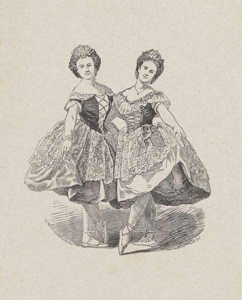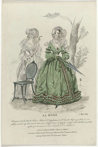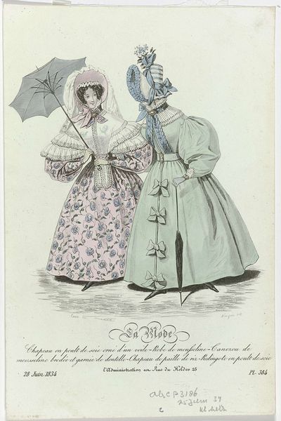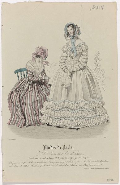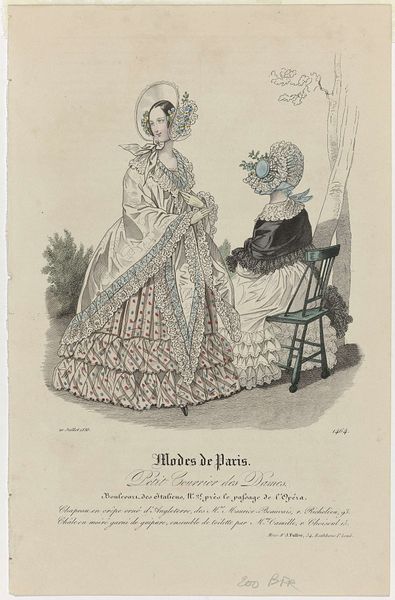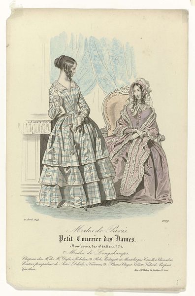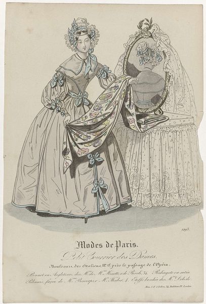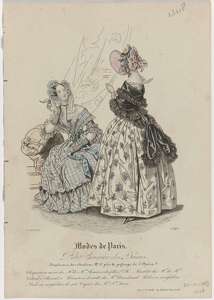 Editor: This is "Petit Courrier des Dames, 5 février 1838, No. 1420: Travestissemens," a lithograph print by Damours, dating back to 1838. It feels playful, almost theatrical. What do you see in this piece? Curator: Immediately, the ‘travestissemens’ or ‘disguises’ jumps out. Consider how clothing and adornment carry encoded cultural signals. These aren't simply dresses; they're costumes designed for spectacle. Notice how the masks and other props accentuate artifice, reminding us of masquerade balls and theater, hinting at performance and altered identities. Editor: So, it’s not just about fashion? It is a disguise, they have masks in their hands. Curator: Exactly. The Romantic era reveled in themes of illusion and transformation, of dreams and heightened emotions. Genre painting like this reflects the era's cultural obsessions and societal rituals through fashion. Editor: I didn't realize fashion prints could be so revealing about social and psychological themes. Curator: They’re far from superficial. Visual elements like the elaborate floral embellishments around the hem. Floral elements and embellishments serve as symbolic details which were easily read in their cultural context. Understanding that cultural language enriches our interpretation of art and its original audience. What do you make of the two figures facing opposite directions? Editor: Perhaps it hints at opposing desires or contrasting social roles, with their interaction suggesting the performance and presentation involved. This isn't simply a display of clothing, it is a window into the period and social performance of gender. Curator: Precisely. Consider, how art continuously reflects us, and shapes our identities, perpetuating and reinventing our cultural memories.
