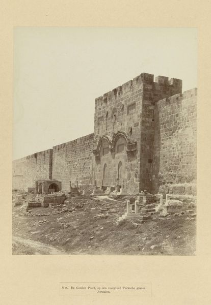 Editor: Here we have a fascinating photographic print entitled "Gouden Poort in Jeruzalem" or Golden Gate in Jerusalem by Maison Bonfils, taken sometime between 1867 and 1895. It depicts a massive stone gate; the stark sepia tones give it a feeling of great age, like a scene from antiquity. What captures your attention when you look at this? Curator: Well, aside from the almost tangible weight of history pressing down from those stones? There's a stillness here, isn't there? Like time itself has paused just for this photograph. It's not just a building, it's a threshold, a place where worlds meet – the earthly and the divine, the past and the present. Does it remind you of something you once imagined, perhaps after reading a forgotten poem? Editor: A bit, I think... There is something both imposing and mysterious in this image. Tell me more about what you mean by worlds meeting. Curator: Consider this gate, sealed shut centuries ago, and wreathed in legend! What stories cling to those stones? What prophecies whisper on the wind around it? For some, it represents a day of Judgement. Perhaps its the photographer, Bonfils, himself imagining a glorious event while in this spot. It feels as though the gate itself is exhaling centuries of secrets, doesn't it? Editor: That makes me wonder, what would it have been like to walk through it when it was open? Curator: Ah, now you're thinking like an artist! To feel that transition, to cross that boundary… To breathe the air on the other side. Imagine! It probably felt, to those passing through, like stepping into a dream. Editor: It is really amazing to consider all of those possibilities. Thank you for shining a light on this intriguing work!