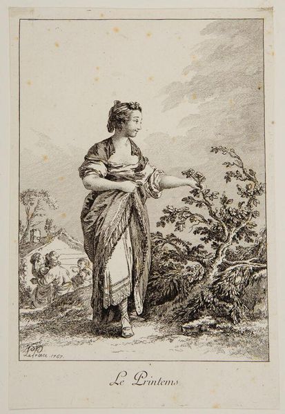 Curator: This is Bartolomeo Pinelli's "Woman from Aversa," an etching—probably from the early 19th century—held in the Harvard Art Museums. It’s a small piece, just six by four and a half inches, but it carries a whole world within it. Editor: Yes! She stands so matter-of-factly—it's almost like a photographic snapshot. But what's she carrying in that sling? It looks a bit like ostrich eggs. Curator: Those are cheeses, actually. She is probably on her way to sell them. It's interesting how Pinelli captures the everyday life of ordinary people. Not royalty or mythical gods. Editor: Right, a celebration of the quotidian. The etching technique, too, gives the scene a certain stark realism. No frills, just a woman and her wares against the land. It is an earthy goddess, of sorts. Curator: An apt description. Pinelli reminds us that the beauty is in the doing, in the survival, and in the story that everyday life tells. Editor: Absolutely. It gives us a deeper appreciation for the things we take for granted. Cheese, a woman's labor, and art's ability to immortalize them.