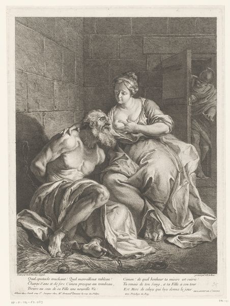 Matthijs Pool made this print, "Isaak en Rebekka bespied door Abimelech," using engraving, a process of incising lines into a metal plate, likely copper, which is then inked and printed. The precision of the engraved lines dictates the work's visual texture, from the robust architectural details to the intimate portrayal of Isaac and Rebecca. Engraving requires immense skill and time, reflecting a significant investment of labor. The clarity and detail achieved through this method were highly valued, appealing to a market that appreciated both artistic skill and the narrative being depicted. The print's ability to disseminate images broadly was a powerful tool in the 18th century, connecting viewers to biblical scenes like this one. By focusing on the materiality and making of this print, we can move beyond its subject matter, and appreciate the artistry and cultural context in which it was created, blurring the lines between craft and fine art.