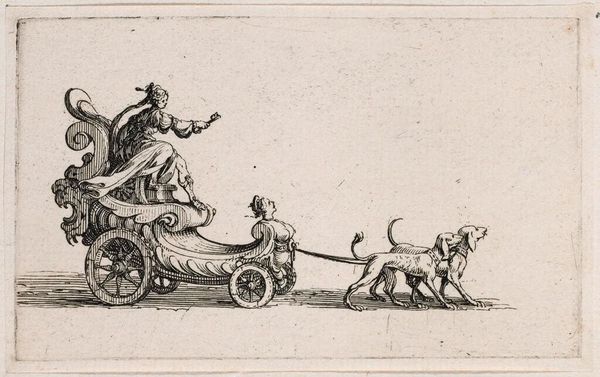 Editor: This is Jacques Callot's small engraving, "Saint Conon." It looks to me like a scene of cruelty and forced labor. What do you see in this piece? Curator: Well, the scene certainly depicts the martyrdom of Saint Conon, a rather gruesome affair if we're being honest. It’s interesting how Callot uses the small scale to create a sense of distance, almost like we're observing a miniature drama. And the horses, so full of life, unknowingly pulling a man to his death – there's a certain irony, don't you think? Editor: That's a dark humor. I didn’t consider that. Curator: Callot was a master of capturing the complexities of human experience, even in the face of brutality. These old masters know how to convey a story through such a small artwork.