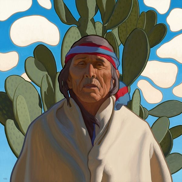Logan Maxwell Hagege made this painting, "Light Geometry," sometime in the 21st century. It shows a Native American figure rendered with bold simplification. The image presents an idealized, depersonalized vision of Native Americans and their relationship to their land. The serene and noble figure is harmonious with the landscape, seemingly at one with the earth. Hagege’s painting perpetuates a long history of representing Native Americans as figures of the past, rather than of the present. Such artworks have deep roots in the history of American institutions. The mythologizing of Native Americans, in painting and photography, served the purposes of the expanding American state in the late 19th and early 20th centuries. We can consult archives and historical societies to better understand the impact of this art.