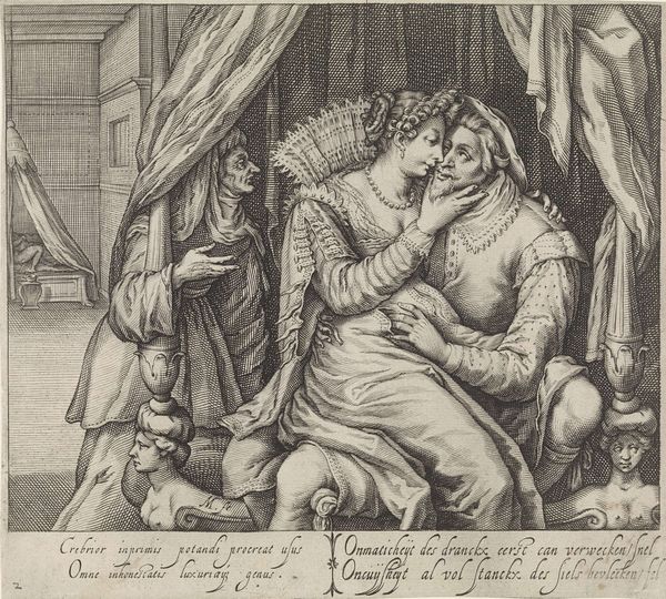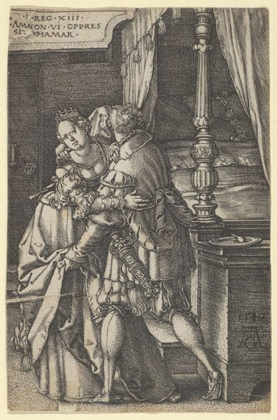 Editor: So, this is "The Procuress: An Old Woman, A Soldier, and A Woman," an engraving by Renier Persyn, created sometime between 1630 and 1668. The figures seem frozen in a kind of negotiation… it's all so theatrical. What do you see in this piece? Curator: I see a potent critique of power dynamics masked as genre painting. Consider the historical context. This print emerges from a period of immense social upheaval and the rise of mercantilism. What happens when societal structures prioritize economic gain over individual autonomy? Editor: Are you suggesting the image critiques the commodification of relationships? Curator: Precisely. The "procuress," traditionally positioned as a facilitator of transactions, highlights the entanglement of women's bodies with financial exchange and military might. Who benefits in this interaction? Look at the subtle details of the woman's posture, the soldier's dominating grip. What is being traded here, and at what cost to female agency? Editor: It seems to show the woman is trading sexual favors for money, with an older woman managing the transaction, which is exploitative... So how do the identities of each character affect this scenario? Curator: This print highlights the lack of access to safe options, and the abuse of institutional power that led them there. It gives food for thought about a world still reliant on unequal power relationships today. What about you? Do you see anything different in this picture? Editor: The image definitely complicates simple narratives about the past. Thanks, I really appreciate that insight! Curator: Me too. It reminds me the necessity to stay conscious of the various facets surrounding an artwork's birth, not to take anything for granted.