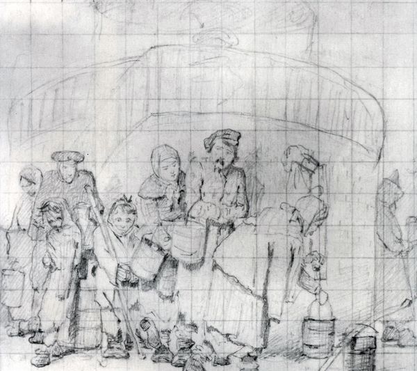 Curator: Here we have William Roberts' "Study for ‘Don’t e know Jarge, tha be no Resurrection’" from his later period. Editor: It's odd, isn't it? Makes me think of a stage set—figures frozen mid-action, waiting for the curtain. Curator: Roberts was always interested in the representation of labor, and this study shows that. The artist depicts figures engaged in manual work, surrounded by what looks like sculptural forms and a grid, indicating it's a design. Editor: The grid gives it a strangely technical feel—like a blueprint for… well, something quite absurd. Resurrection, maybe? Curator: The inscription at the top suggests a questioning of traditional beliefs through the lens of working-class experience, rendered in a deliberately rough style. Editor: It feels like Roberts is winking at us—a bit skeptical, a bit playful. I find myself pondering the act of creation here, both artistic and manual. Curator: A fitting thought. The piece reminds us that even preparatory work like this can reveal so much about the artist's intent and process. Editor: Absolutely. I love how Roberts manages to capture a sense of both the mundane and the marvelous in a single frame.