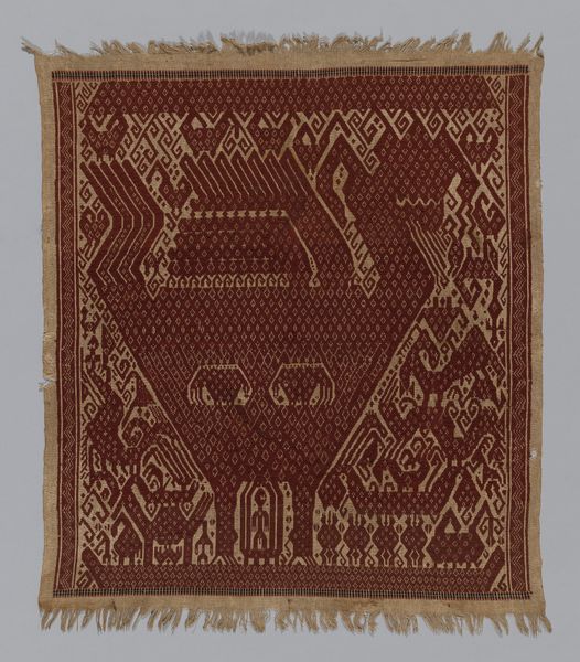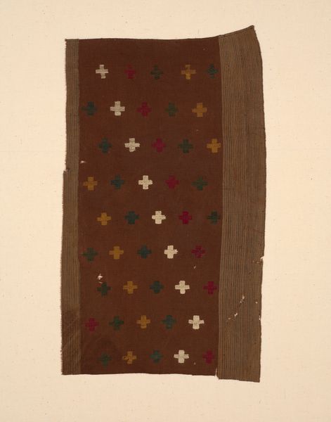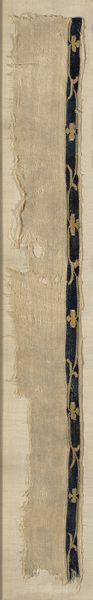Editor: Here we have a textile fragment titled "Band," dating back to the 5th or 6th century, from Roman-period Egypt. It’s currently held at the Art Institute of Chicago. Looking at this weaving, I immediately get a sense of quiet resilience; what is your take on this piece? Curator: "Quiet resilience" -- I love that. This fragment whispers stories, doesn't it? Imagine it once part of a larger tunic, perhaps adorning someone navigating the bustling streets of ancient Egypt, already a crossroads of cultures. I see the persistence of tradition mingling with new influences. Tell me, what do the repeated motifs evoke for you? Editor: They feel…almost like stylized hearts, but with a definite ancient, symbolic weight to them. There's something about the repetition that’s both decorative and meaningful. Are these symbols of the time? Curator: Precisely. Scholars think those could represent vegetal motifs – perhaps stylized leaves. Now, consider the craft involved. Each thread a deliberate choice, dyed, woven. That crimson would have been vibrant. What does it tell you about the individual that was responsible? Editor: The level of detail certainly implies skilled craftsmanship but also a dedication to a craft that’s almost meditative in nature. It brings forth the person, which stands the test of time through an artistic and almost timeless dedication of the artist, giving some new form, through symbolism of that time. Curator: It gives you that special perspective of connection with someone, even through centuries! Textiles like this bridged practicality and belief. Garments weren’t merely clothing; they communicated status, faith. Even now, damaged as it is, it continues to speak volumes. Editor: Absolutely, a tangible link to a world both familiar and utterly different from our own, expressed through woven threads and vibrant dyes! I wonder, will our clothes hold similar mysteries a thousand years from now?