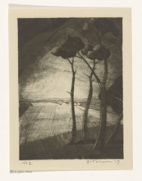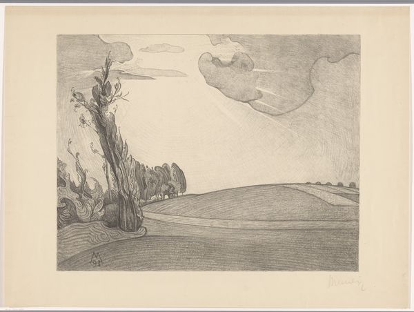 Editor: We’re looking at Simon Moulijn's "Ophelia drijvend in het water," an etching from 1922, housed here at the Rijksmuseum. There's such a stillness to it, a quiet darkness emphasized by the light pencil work. What elements of its composition stand out to you? Curator: The stark contrast between the ethereal face and the dark, enveloping water immediately commands attention. Consider the strategic placement of the head: its horizontal orientation perfectly mirroring the water's surface, creating a sense of unsettling repose. Notice also the artist's deliberate choice to obscure the body. Do you observe how this absence contributes to the sense of mystery? Editor: I do. It's almost dreamlike. What about the use of line? It feels quite delicate. Curator: Precisely. The etching technique allows for a remarkable delicacy. Observe how the lines describing the water aren't simply lines but tonal variations. Notice the difference between the tightly hatched area beneath her chin, contrasting with the broad strokes that define the surrounding water. This adds depth and contributes to the feeling of her body sinking into the landscape. Editor: So the technique reinforces the theme? Curator: Indeed. And the dark tones that frame her face draw us in; consider how the branch above and the weeds below serve as visual anchors, focusing our gaze. Ask yourself, what is the effect of this careful arrangement? Editor: I see… they create a visual frame, trapping her in the watery scene. I’d initially focused on her expression, but looking at the formal aspects of the composition reveals another layer of meaning. Curator: Absolutely. It’s in this intricate interplay between subject and execution that we start to unlock the work’s true power. Editor: Thanks, looking at how Moulijn used technique and form has really enhanced my appreciation of this image.