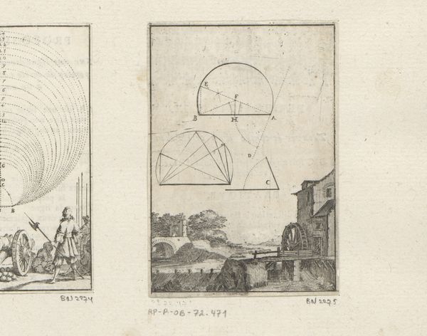 This print, "Afsnijden van een deel van een rechte gegeven lijn met onderaan een staande man," was made by Sébastien Leclerc I. Here, mathematical precision meets human presence, a peculiar juxtaposition emblematic of the 17th-century's quest to reconcile science and the human experience. The geometric diagrams above symbolize order and reason. Below, the figure is set against a landscape, perhaps representing humanity's place within a structured universe. The juxtaposition of abstract geometry and human representation echoes motifs found throughout art history, from classical architectural drawings featuring human figures for scale to Renaissance allegories where geometric forms underpin symbolic narratives. This dialogue between order and chaos, reason and emotion, mirrors our own internal struggles to find balance in an often unpredictable world. It’s a powerful reminder of the complex interplay between the conscious and subconscious. The recurring imagery, a constant return to the human figure within a structured environment, highlights our enduring quest for understanding.