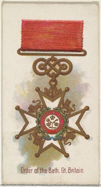 Curator: This small lithograph print, made in 1890, depicts the Order of the Dannebrog from Denmark. It comes from a series titled "World's Decorations," made for Allen & Ginter Cigarettes. What strikes you about this piece? Editor: It’s got a certain faded grandeur, hasn't it? All those minute details, like the miniature crowns integrated into the cross. It makes me think about what kinds of tools they might’ve been using in the print shop to pull this off and who might have designed such a small trinket? Curator: Indeed. There's a remarkable level of detail considering its size. The texture created with lithography lends a certain softness, even a dreaminess, to the symbol. It’s interesting how such meticulous craft can convey something beyond just formal representation. Does it say "art nouveau" to you? I'm on the fence here. Editor: Absolutely Art Nouveau, but in a commercial context. Those decorative flourishes and that faded pastel palette…it's decorative art at the service of industrial capitalism. I can almost smell the tobacco leaves and imagine this little prize tucked inside a cigarette pack! This card functioned as a value-added novelty that simultaneously promotes loyalty to empire, God, and good taste! Curator: You know, seeing how delicately rendered these objects are gives me a feeling that we almost have some secret symbolic language present within them. Perhaps something they don’t realize they're passing on—some whisper of deeper, almost forgotten connections to the cultural idea of "decoration." Editor: Agreed. But these aren't meant to be decoded so much as consumed. Consider the relationship of print workers at the factory level versus consumers enjoying cigarettes—a whole story emerges! The availability of affordable print technology made pieces like these—small objects in vast quantities—possible at scale. Curator: In that light, it goes beyond the immediate aesthetic impact to open us up to social considerations! These images also trigger emotions—that feeling that “so much has gone into this”, even when they come from a space of overwhelming machine creation. Editor: Absolutely, let's keep that in mind. It reminds me that even in the smallest artifacts, one can uncover a world of meaning and making, from worker alienation to the illusion of high class in the Gilded Age. Curator: Precisely, even for such an understated, pretty thing. The material history here takes on a kind of poignancy, reflecting that bygone world!