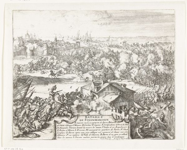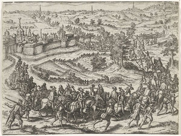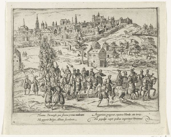 Editor: We're looking at "Arrival of the Duke of Alva in Brussels, 1567," an engraving from around 1613-1615. It's incredibly detailed. The sheer density of figures creates a striking visual effect. What stands out to you? Curator: Immediately, the composition seizes my attention. Observe how the artist organizes the space. We have a foreground teeming with activity that gradually recedes into a more sparse background, defined by regimented clusters of soldiers. This deliberate recession, created through careful linework and perspective, establishes a clear visual hierarchy, does it not? Editor: I see what you mean. The lines do seem to pull the eye back. Curator: Precisely. Notice, too, how the use of hatching and cross-hatching delineates form and texture. The artist has achieved a remarkable tonal range using only ink. Are there any specific motifs that attract your eye? Editor: Well, I’m drawn to the figures running in the foreground, and that cute dog! It gives a sense of movement in contrast to the more static groups. But also how they're depicted as quite small compared to others further away, with very detailed rendering and perspective. It’s interesting how they managed that. Curator: Yes! These figures effectively underscore the arrival, emphasizing the contrast between action and imposed order. Consider how this reflects anxieties present during that period? Ultimately, the drawing showcases skill in using graphic means to organize intricate spatial relationships, regardless of its historical implications. Editor: That's a fascinating way to look at it. Thanks! Curator: A worthy analysis! Thank you for pointing that out.