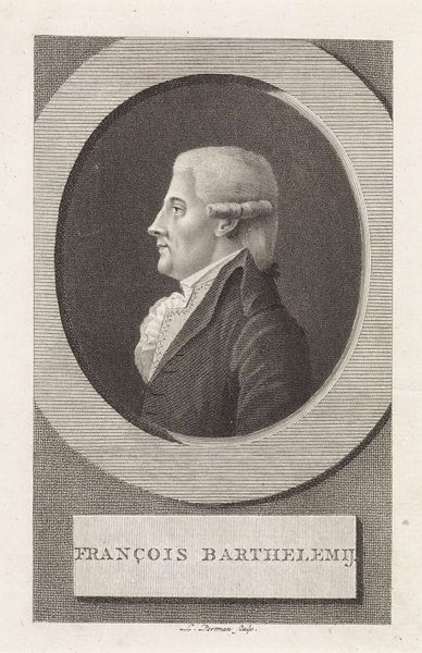 Curator: Here we have a piece titled “Portret van een man”, identified as a portrait of Gaspare Antonio Baroni di Cavalcabo, executed in the baroque style. This print, made sometime between 1692 and 1759, showcases a beautiful use of engraving. Editor: The crispness of the lines is the first thing that strikes me. Look how they build form and texture. There's almost a woven quality to the jacket achieved with such delicate etching. Curator: Indeed. As a print, this portrait allows for wider circulation, reflecting the democratization of images in the early modern period. Portraiture, once reserved for the elite, becomes increasingly accessible. This availability served specific societal needs to define, document and solidify emerging class identities through this accessible medium. Editor: I see how that plays out in the composition as well. The sharp profile view, framed in that precise circle—it all reinforces a controlled sense of decorum. Notice how even the folds of the cravat suggest order rather than ostentation. Curator: This particular Baroque rendition displays a notable move toward Enlightenment ideals of rationalism, favoring clarity of line and form over heavy ornamentation, hinting at a societal shift. While still refined, it avoids the dramatic flamboyance typical of earlier Baroque art, perhaps showing this man as reasonable rather than flamboyant, Editor: I hadn’t considered that, but the even lighting certainly contributes. There's an elegant balance between detail and restraint here; see the way his gaze and expression capture attention with minimal drama? It is more about controlled observation, less about high theatrics. Curator: It prompts me to wonder about di Cavalcabo’s role in his society and how he strategically used this portrayal to convey specific messaging regarding his societal presence and ideals. Editor: So, the formal elements suggest a narrative of reasoned elegance... It’s all about presenting an image of intellect and control within a social context. Interesting, isn’t it? Curator: Absolutely, that’s a very astute observation of the intersection of aesthetic and social intentions here. Editor: It allows for deeper exploration, this concise rendering.