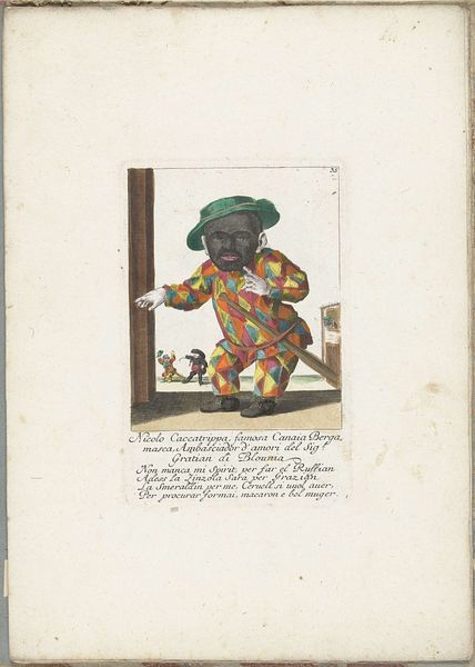 Curator: Before us, we have "Negro Mammy Bank," a watercolor painting by Robert Clark, dating circa 1937. What strikes you first? Editor: Immediately, it’s the stillness, almost a stubbornness, in her pose. Arms crossed, a sort of 'I'm-not-budging' stance. The vibrant red polka-dot headscarf contrasts so starkly with the somber hues everywhere else...it's quite striking. Curator: It's interesting you notice that tension. Visually, these "Mammy" figures were quite prevalent; often depicting black women in domestic roles. Do you see symbolic weight in the representation? Editor: The figure’s outfit screams “domestic worker,” certainly. The pristine white apron seems at odds with her sturdy, almost confrontational posture, no? There is a potent paradox here; it could be said that it embodies the history of exploitation while subtly acknowledging a resilience… the endurance beneath the stereotype, a whisper of autonomy? Curator: Indeed. Consider the medium as well—watercolor can often lend itself to fleeting impressions, but Clark employs it with precision here. Does the application offer any insight for you? Editor: Yes, there’s something carefully rendered about it; those crisp edges! The color palette gives me pause. The deep blues seem so unnatural in their intensity. It certainly hints at an unease… I'd say it's no mere documentary piece. It's fraught with layers! The title too carries such weight… so overt, so matter-of-fact...it almost feels like a challenge. Curator: Precisely. The naming itself almost seems ironic when paired with the other layers we are unveiling. So, reflecting back on your initial response—that first visceral reaction to the stillness and stance, do you still hold the same perspective now that we have had this dialogue? Editor: I do. More than ever! To witness that level of complex personhood struggling within such a reduced visual symbol speaks of the artist’s own struggle and sensitivity; despite its obvious historical discomfort, there remains a certain profound intimacy. It’s that flicker beneath the surface that ultimately haunts. Curator: I concur, that underlying intimacy that is hard to overlook is where I end, it's like seeing resilience hiding in plain sight, wouldn't you agree?