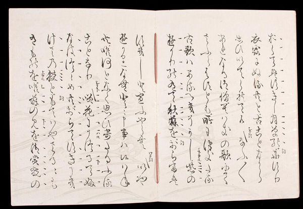 Editor: Here we have a page from 'Printed NÅ Play with Calligraphy by Hon'ami KÅetsu,' published by Suminokura Soan. The strokes and forms create such a dynamic and fluid impression. What can you tell me about the composition? Curator: Observe how the characters cascade and interweave, creating a complex yet harmonious relationship between form and space. The brushstrokes themselves, their weight and direction, become significant elements in understanding the work's structure. Editor: So, it's less about the literal meaning and more about how the calligraphy occupies the space? Curator: Precisely. We must consider the calligraphic forms, their individual dynamism, and their interplay within the frame. It's a structured dance of line and void. Considering its intrinsic qualities allows for a deeper appreciation. Editor: I see that now. Focusing on the art elements, I can appreciate the composition regardless of whether I can read the calligraphy or not.