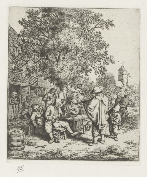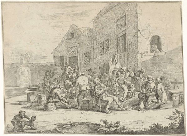 Editor: This is "Hanengevecht" by Matthijs Schoevaerdts, created between 1682 and 1702, an etching depicting a bustling street scene. There’s almost too much going on—people are haggling, climbing ladders, and right there in the front, well, the chickens are at each other! How do you unpack something so crammed with everyday life? Curator: It's fascinating to consider the historical context of these genre scenes. "Hanengevecht," meaning "cockfight," isn’t just about the spectacle itself; it’s a window into the social and economic life of the period. These gatherings served as spaces for trade, socializing, and displaying status. What do you think this print tells us about the artist's perspective or intentions? Editor: I suppose it's a snapshot, capturing all social classes mixed together…maybe with a critical eye? The people look kind of… exaggerated? Curator: Exactly! Consider the exaggerated gestures and expressions. Do you think Schoevaerdts is simply documenting reality, or perhaps commenting on the chaos and maybe even the underlying inequalities present in these public spaces? Was it considered acceptable entertainment for the time? Editor: That’s true! Cockfighting as entertainment makes me uncomfortable and wasn’t legal for all classes even at that time. The etching does invite the viewer to consider power dynamics. It’s both documentation and critique, I think. Curator: I agree. The choice to depict this scene, rather than idealized landscapes or portraits favored by the elite, positions Schoevaerdts within a tradition of artists engaging with the everyday lives of ordinary people. Understanding art in its historical and social contexts helps us move beyond simple aesthetics and into complex social critiques. Editor: It’s incredible to think how much a simple print of a street scene can tell us! Looking at the social role that artworks have gives me much more appreciation than looking at beauty or visual pleasure.