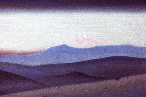 Nicholas Roerich created "Traces (Mountain Wanderer)" with tempera on cardboard sometime in the first half of the 20th century. Roerich was a Russian artist, philosopher, and public figure, deeply influenced by the spiritual traditions of the East. Here, in the form of a lone figure traversing a snowy mountain landscape, Roerich visualizes an intensely personal and spiritual journey. The wanderer, dwarfed by the immensity of the mountains, becomes a symbol of human resilience. His or her journey speaks to our shared human experiences. Roerich’s use of a muted palette, primarily blues and whites, evokes a sense of serenity. Roerich believed that art could awaken a deeper understanding of humanity’s shared spiritual heritage. Consider how this painting invites you to contemplate the intersection of personal exploration, and the quest for deeper meaning.