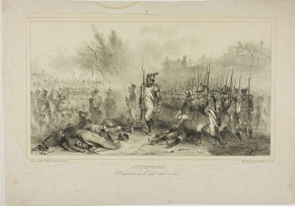 Willem Hendrik Hoogkamer created this print of the Battle of Leuven in 1831 using etching. It's a process that begins with a metal plate, typically copper or zinc. The artist covers the plate with a waxy, acid-resistant ground, then scratches an image into the ground with a needle. The plate is then submerged in acid, which bites into the exposed metal, creating lines. The longer the plate sits in the acid, the deeper and darker the lines will be. Ink is applied to the plate, filling the etched lines, and the surface is wiped clean. Finally, the plate is pressed onto paper, transferring the ink and creating the print. The linear quality of the etching lends itself well to the depiction of battle, all those individual strokes mimicking the dynamic action and detail of the scene, from soldiers to horses to puffs of smoke. It is an inherently reproducible medium, well-suited to conveying patriotic fervor to a wide audience at a critical moment in the history of the Netherlands. This kind of printmaking demonstrates that the aesthetics of craft and fine arts can merge to create something both beautiful and socially relevant.