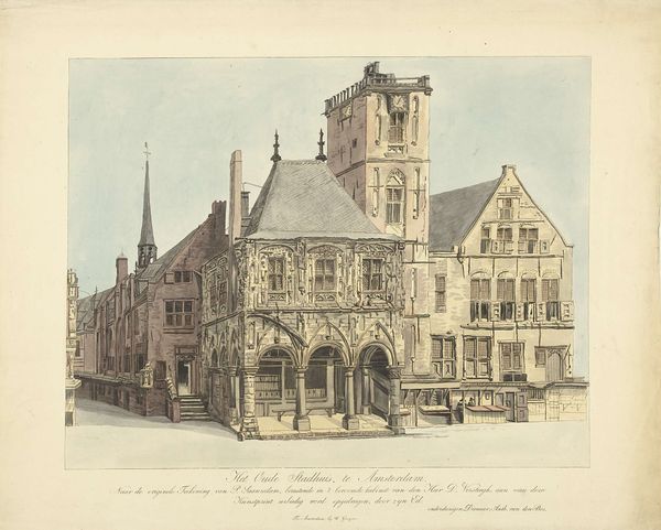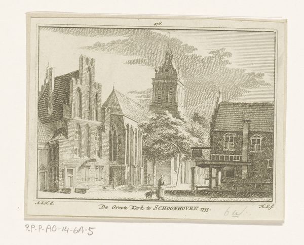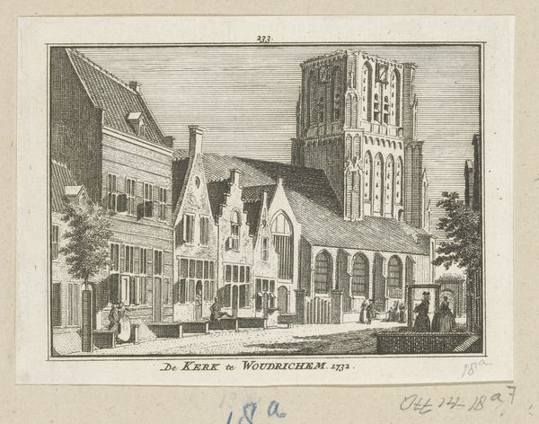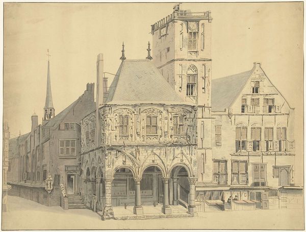 Editor: Here we have Cornelis Pronk's "Gezicht in Woudrichem," created in 1732 using ink on paper. There's such a stillness to it, like the world is holding its breath. What stands out to you when you look at this piece? Curator: It whispers of time, doesn't it? The delicate ink work renders Woudrichem as a stage set, where the buildings are players in a quiet drama. Pronk had an incredible ability to capture architectural details. The Dutch Golden Age valued these accurate portrayals. This work makes me reflect on how fleeting human existence is against these enduring buildings. Editor: I love the level of detail he gets with just ink. The shadows give a sense of depth that you don’t usually see in drawings of this era. Do you think it was meant as just a study? Curator: Perhaps, though it feels so complete. And he isn't simply copying reality. Pronk selectively emphasizes elements, crafting a visual narrative. Notice how the tower commands attention? That draws the eye upward and helps solidify the building. The slight artistic license amplifies the feeling it evokes, don’t you think? Do you feel a connection with this scenery? Editor: It’s like a memory of a place, real but also slightly dreamlike. I initially felt like it was more observational. Curator: Ah, but that's the beauty, isn’t it? Observation filtered through a poetic sensibility. Pronk hands us more than just a landscape; he gives us an emotion, a fleeting moment captured forever. Editor: I didn't initially pick up on how much it makes me think. Now I have a greater appreciation for Pronk and the work beyond the historical depiction of the place. Thanks. Curator: Exactly, seeing is not only about eyes. Thank you for such an interesting and thought-provoking perspective.