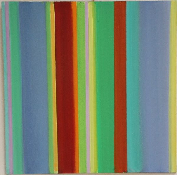 Editor: Here we have Morris Louis's *Nexus II*, from 1959. It’s an acrylic on canvas. I find its bands of color—blue, beige, and green—quite calming, almost like looking at a simplified landscape. How do you interpret this work? Curator: These veils of color, seemingly simple, echo a history of cultural symbolism tied to nature. Consider how blue has represented the heavens, green, growth and life, and beige, perhaps, the earth from which they spring. The painting becomes a sort of primal landscape, almost pre-human in its abstraction. Do you sense any connection to nature? Editor: I hadn’t considered the colors so literally, but now I do see those associations. I was more focused on the abstract composition. The way the colors bleed into the canvas almost feels like watercolors, doesn't it? Curator: Precisely! The lack of harsh lines lends a fluidity reminiscent of memory itself, constantly shifting and blending. Notice how each color impacts the others, their boundaries blurring. Does that suggest any interplay, any relationship between the colors? Editor: I think it does, like the colors are reacting with each other and evolving in relationship. It feels like an intentional dialogue between the individual hues and the space surrounding each of them. Curator: A beautiful analogy. These "stains," as Louis called them, pull from our collective unconsciousness and personal experience with the natural world and force them into a conversation within ourselves. And that middle color provides some contrast for those of us examining and interpreting. Editor: That's so true. It makes you think about all the history these symbols represent and how they still resonate with us. Curator: Indeed. Through his color choices, Louis unknowingly unearthed this symbolism that persists through cultural memory, evoking primal human sentiments toward color, nature and meaning.