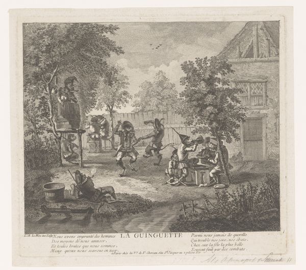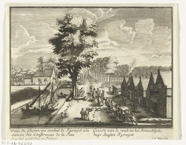 Adriaen Schoonebeek made this print in 1697, documenting the entrance for the allies to Huis ter Nieuburch in Rijswijk. As an etching, the image begins with a metal plate, likely copper, meticulously coated with a waxy, acid-resistant ground. The artist then uses a sharp needle to scratch away the ground, exposing the metal beneath. This is a skillful, labour-intensive process - consider the incredible detail Schoonebeek achieves through the fine lines of the print, from the leaves on the trees to the folds in the clothing. Immersing the plate in acid then bites into the exposed lines, incising the image onto the surface. Finally, the plate is inked, and then pressed onto paper. The physical pressure of the printing press imprints the image, revealing the artist’s handiwork. This print isn’t just a picture; it’s a record of skilled labor, chemical reactions, and mechanical force. Paying attention to these processes allows us to appreciate the cultural and social significance of even a seemingly straightforward historical image.