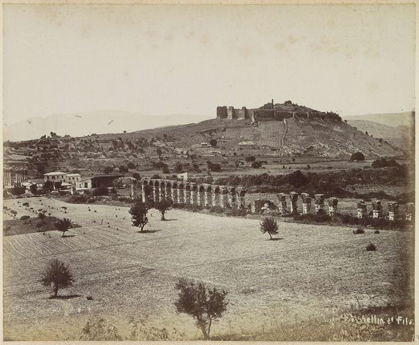 Curator: John B. Greene’s photograph, "The Aqueduct of Cherchell, Algeria," captures a monumental structure dwarfed by its natural surroundings. There’s a striking stillness to the image. Editor: Yes, a stillness that speaks to the quiet violence of colonial presence. The aqueduct, a symbol of Roman engineering, becomes a marker of occupation within the Algerian landscape. Curator: Beyond that, the aqueduct itself embodies a human desire to master the elements, to channel life-giving water. It’s a symbol of progress, certainly, but also control. Editor: Control wrested from the Indigenous population, no doubt. That infrastructure, so lauded, likely came at the expense of displacement and resource exploitation. Curator: It certainly invites reflection on layers of history, each leaving its mark on the land. The photograph, then, acts as a record, a memory held in sepia tones. Editor: Precisely. We must remember whose stories are often erased in these seemingly objective landscapes. The aqueduct stands, but who paid the price for it?