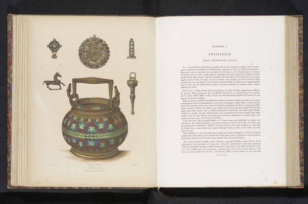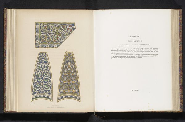 This is a reproduction of designs by Moulin, showing a book cover, medallions, the shield of France and pedestals. Considered as an ensemble, these designs represent the cultural project of 19th-century France, evoking national history through images of heraldry, royalty, and religion. Books, shields, and pedestals speak to France's cultural institutions, political history, and public spaces. What meaning did these images have at the time? We might consider the role of the museum and the library as institutions of national identity. The shield of France is a particularly potent symbol of national pride and military power. The medallions might have had a more religious significance, reflecting the ongoing influence of the church in French society. To fully understand this image, we need to explore the visual culture of 19th-century France, tracing the use of such symbols in other media such as painting, sculpture, and architecture. We also need to research the social and political context in which these images were produced, asking who commissioned them and what purposes they served.