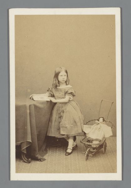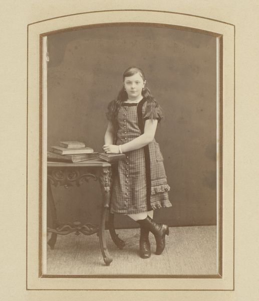 This small photograph, "Le chemise Russe", was made by Pierre-Louis Pierson sometime in the mid-19th century. Its subdued sepia tones are characteristic of early photographic prints, often achieved through processes like albumen printing, which uses egg whites to bind the image to the paper. Looking at the photograph, we see a young girl dressed in what appears to be a Russian-style shirt. The garment, with its decorative trim and loose fit, suggests a certain level of craftsmanship, even if it's meant to evoke a foreign culture. The girl stands next to an ornate tufted sofa, highlighting the opulence associated with upper-class Victorian society. The choice of clothing and setting is likely a deliberate attempt to create an exotic, staged image, meant to be consumed by those who had the means to collect such items. Even though photography was becoming more accessible at this time, it was still a relatively expensive process. Paying attention to materials, how they are made, and the context in which they circulate allows us to fully appreciate and understand the many layers of meaning in this photograph.