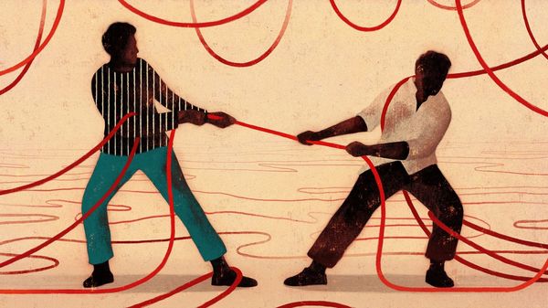 Curator: This watercolor and line painting from 2018 is by Owen Gent. It's called "BBC Focus Magazine – We Need to Talk About Male Suicide". It's immediately striking, wouldn't you say? Editor: It evokes a profound sense of entrapment and precariousness. The figure's posture, suspended amongst those converging lines, is unsettling. There's a visual tension that grabs you. Curator: Indeed. The figure, caught mid-air, is literally tied up within this network of red strings. The symbolism feels very explicit, doesn’t it? He's enveloped, ensnared… the red perhaps signifying distress or warning. Considering the artwork was commissioned to illustrate a magazine article, what are your thoughts on how it works as a piece of socially engaged imagery? Editor: The strings might well symbolize the complex pressures men face in contemporary society – societal expectations, emotional constraint, vulnerability, isolation. The choice of watercolor also resonates – it’s a medium known for its delicate washes and fluidity, but also for being rather unforgiving. Curator: I appreciate your interpretation of the materiality. The colour palette here, limited and muted, focuses attention squarely on the body and the stark geometry of the red lines. I would say it functions quite simply from the semiotic perspective; red means ‘danger,’ it is the artist’s sign for external constraint imposed on the vulnerable, central male subject. Editor: Agreed. But this central figure... anonymous, nearly faceless. He serves less as a particular individual, and more as an Everyman. This lends a universal quality, broadening the image’s potential impact within public discourse, in raising consciousness of a social problem. Curator: Precisely, it is more representative of male figures across different sectors of the population. His lack of clear features allows viewers to project themselves onto his predicament. A clever compositional technique that enhances engagement and dialogue. Editor: Looking at it this way, Owen Gent has created a particularly resonant image, one that compels a societal reckoning. The visual encoding really reinforces the conceptual and historical weight of its cultural commission, namely the discussion of men’s mental health. Curator: It’s a prime example of how formalism can underscore meaningful, and indeed vital social narratives.