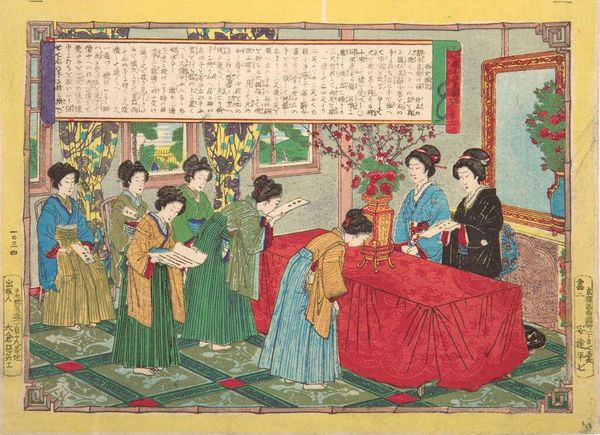 Editor: This print, "Mirror of National Costumes of All Nations" by Kobayashi Kiyochika, dates to 1882. It's a woodblock print showcasing a diverse group of people in traditional clothing. It almost feels like a staged gathering. What strikes me most is how each figure is presented with equal attention, yet their expressions remain quite neutral. How do you interpret this work? Curator: What you're picking up on is precisely what makes this print so compelling. Beyond just a survey of global attire, Kiyochika's print functions as a commentary on Meiji-era Japan’s relationship with the world. The evenhandedness you observed resists a colonial gaze. What could this mean during a period of intense Westernization? Editor: It’s like… a record without judgment? Almost anthropological? Curator: Exactly! The artist uses the relatively new medium of mass-produced prints, traditionally used for Ukiyo-e or "pictures of the floating world," to document global diversity. This embrace of different cultures challenged entrenched views on national identity. Editor: So, it’s not just about pretty clothes, but about redefining Japan's place among nations. The artist seems to advocate for cultural exchange, or at least acknowledges that the world is bigger. I'm really impressed. Curator: Absolutely! It questions the established social hierarchies of the time. Consider the implied power dynamics here – who gets to define "national costume," and for whom? By democratizing this visual space, Kiyochika subtly subverts traditional power structures. Editor: I never would have thought of that, I see it now as less of an innocent picture, and more of an artistic act of cultural defiance. Thanks! Curator: My pleasure. The work opens up complex issues relating to cross-cultural exchange, power, and representation that are still important now.