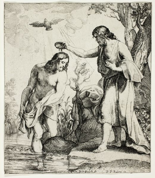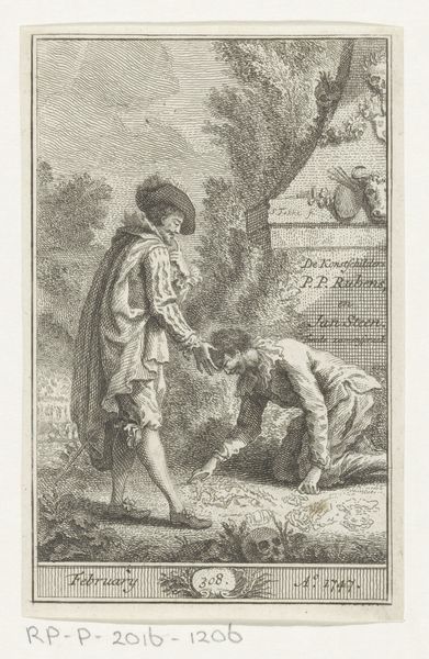 This is W.A. Müller's engraving, "Abraham og Isak," made in 1762. The stark contrast between the etched lines and the blank paper creates a dramatic scene of a father and son in a moment of profound tension. The composition is carefully structured; Abraham gestures skyward, his body forming a diagonal line that is countered by Isaac's more grounded stance. The landscape, rendered with meticulous detail, adds to the emotional weight. Note how the lines create volume and depth, particularly in the rendering of the clouds. This meticulous detail, typical of the Enlightenment, can be read as an attempt to classify and contain the natural world, even as the narrative itself speaks to themes of faith and sacrifice that defy rational understanding. The cross-hatching is a key formal element, not just describing form but creating a visual texture that invites closer inspection. It's a powerful reminder that an image isn't just a representation; it's a constructed object, imbued with layers of meaning through the artist's deliberate choices.