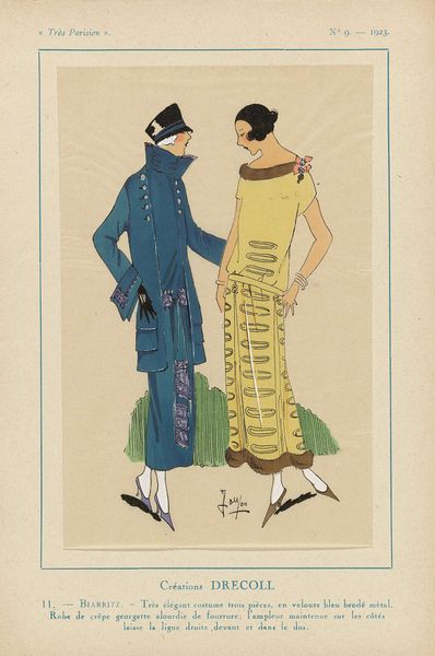 Editor: Here we have "Très Parisien, 1923, No 7: 10.- PRAIRIAL. - 1. Un jersey de laine beige..." a drawing from 1923, currently housed at the Rijksmuseum. It features two women modeling dresses of the time. I find the colour palette and the lines really fascinating! How do you approach analysing this piece? Curator: Initially, the composition strikes me. Consider how the artist has utilized line to define form, particularly in the drapery of the dresses. Notice how these lines create a sense of depth, yet simultaneously flatten the picture plane, pushing the figures forward. It presents an interesting spatial tension. What about the colour? Editor: Well, I think the limited colour palette adds to the Art Deco feel. The beige and the red accents really pop. The patterns seem really detailed too. Curator: Precisely! Focus, for example, on the interplay between the patterns on each dress. Note the geometric simplicity juxtaposed with the organic flow. Then there is the texture created by the pastel medium. This juxtaposition enhances the visual interest. Consider how the choice of pastel contributes to the overall atmospheric effect. Editor: I see what you mean about the tension now. It’s both decorative and representational at the same time! Curator: Indeed. It demonstrates a keen understanding of formal elements. The use of line, color and the flat picture plane all contribute to the piece's aesthetic. It's interesting how a fashion illustration engages with significant artistic concerns. Editor: I didn’t expect such a detailed approach! I was looking at the historical elements, but now I see there’s a whole other level to unpack by considering just the visual aspects. Curator: Exploring these visual relationships allows a richer understanding of both the art and its period.