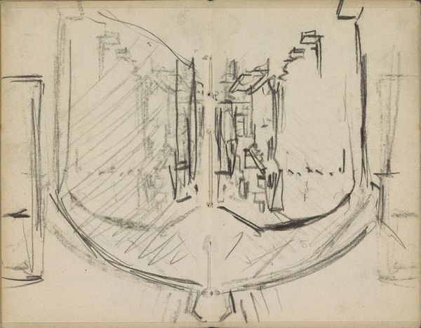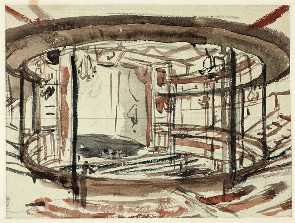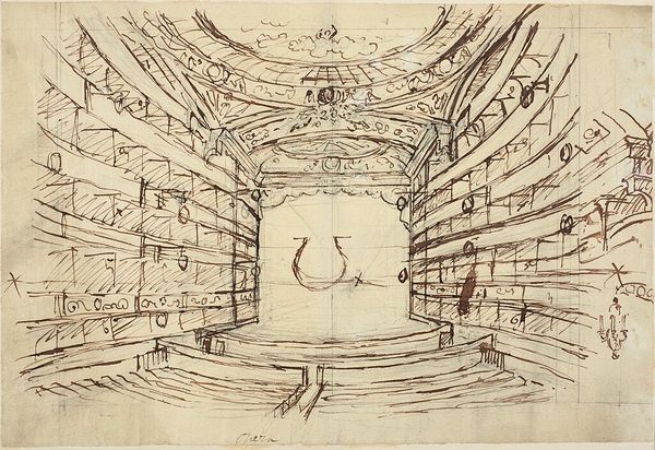 Curator: Augustus Charles Pugin, around 1809, rendering a “Study for King’s Circus." It's a dizzying display of perspective in pen and ink on paper. Editor: My initial feeling? Claustrophobia. All those tiers of boxes looming, pressing inward. It feels less like entertainment, more like… surveillance. Curator: Precisely! The all-seeing eye, Bentham's Panopticon… Pugin, though associated with Neoclassicism, presents it almost as a future prison. Imagine the labor behind each sketched line, defining every ornamental curve of this architecture for future, physical building. Editor: But those lines, they're so frantic, so uncontrolled. Is this the raw state, then? Like a preparatory architectural drawing dashed out, trying to capture a concept? It’s interesting how utilitarian architectural plans might look and then compare it to this creative rendering. Curator: Indeed. He’s capturing light, atmosphere… maybe even the giddy excitement – or dread – of the audience who would eventually fill this space. See how minimal yet detailed everything is by ink alone on this type of paper? Editor: Look at those stage-like balconies. Consider what kinds of social divisions are physically built into these theaters; separating the elite patrons above from those standing below. Did Pugin aim to make us feel this unequal division, a very particular social observation? Curator: Perhaps, but think also about the materials. The wood, the plaster, the textiles—transformed into an immersive spectacle. Editor: But ink itself is a tool for architectural plans to realize those large scale building, and at that stage is not that valuable but only useful for later… Is it supposed to speak to social hierarchies of artistic labor? Curator: Hmmm… you do invite a radical reassessment. In any event, one walks away from this "Study" feeling a lot less sure what sort of pleasure such grand spaces promise. Editor: Yes. Pugin's creation reveals a beautiful diagram with layers of meaning we have only begun to explore.