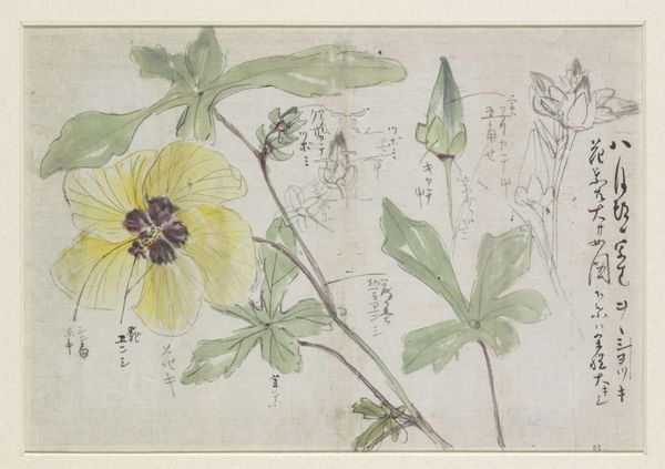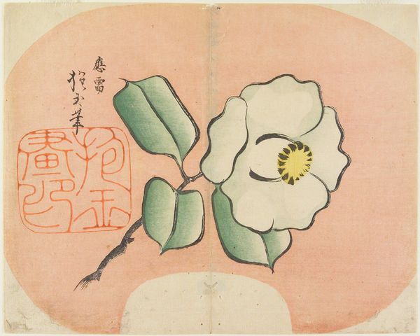 Editor: This is "Large White Flower" by Yamada Hoggyoku, made around the 1830s. It's an ink and color woodblock print, and it has a certain quietness to it, don't you think? The pale colors are so calming. How do you interpret this work? Curator: I see it as part of the fascinating world of Ukiyo-e prints, which captured the fleeting pleasures of everyday life during the Edo period. But let's look closer. Notice how this single flower commands the space. What might that signify to you? Editor: Perhaps it symbolizes beauty in simplicity? Or maybe resilience? Curator: It absolutely can! Consider the social context. Women's voices during this era were often muted. Could this flower be Hoggyoku's way of subtly asserting a feminine perspective, emphasizing beauty and strength in a society with strict gender roles? It becomes a silent, powerful statement. What do you think about this relation? Editor: I never thought about it that way! It’s amazing how the artwork could be used for conveying social awareness. It completely changes how I look at the flower itself. Curator: Exactly! Art often operates on multiple levels. Exploring those layers – historical, social, personal – unlocks deeper meanings. What do you make of its placement against that plain background? Editor: That’s interesting; it feels intentional in creating tension. By pairing these elements the artist pushes us to think of something. Curator: And how those considerations interact with the role of the woman at the time? It reveals many perspectives. Thank you for this amazing observation. I never thought of it like that before!
