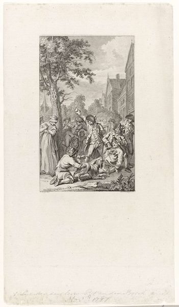 Editor: This is "Nachtgezicht met gewapende mannen rond een lijk", or "Night View with Armed Men Around a Corpse", an engraving by Reinier Vinkeles from 1792, held at the Rijksmuseum. It's incredibly detailed; I'm struck by how dramatic it is. What draws your eye in this piece? Curator: Formally, I am compelled by the stark contrast between the shadowed foreground and the illuminated architectural backdrop. Vinkeles’ masterful control of line weight and density creates a palpable sense of depth and drama. Observe how the diagonal thrust of the fallen figure’s body is echoed by the lines of the cobblestones, guiding the viewer's gaze. What significance do you ascribe to the plumes of smoke emanating from the melee? Editor: I hadn’t considered the lines of the cobblestones! The smoke seemed simply to add to the chaos. Curator: Indeed, the smoke serves both a compositional and textural purpose. Texturally, it softens the harsh linearity of the engraving, adding atmospheric depth. Compositionally, it acts as a visual bridge, linking the violence in the foreground to the implied unrest in the distant city. Notice how the architecture itself – the sharp, classical lines – seems almost to observe the turmoil, providing a silent commentary. The rigidity is punctuated by what transpires, so does it heighten the violence? Editor: It’s fascinating how much the composition contributes to the story, regardless of historical context. It all contributes to this sense of organized chaos. Curator: Precisely. It reveals a consciousness of structure and surface inherent in the piece, offering a rich area for analysis. Editor: This has really highlighted how close analysis of artistic techniques can open up new ways to understand a work. Thank you!