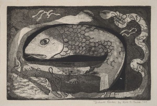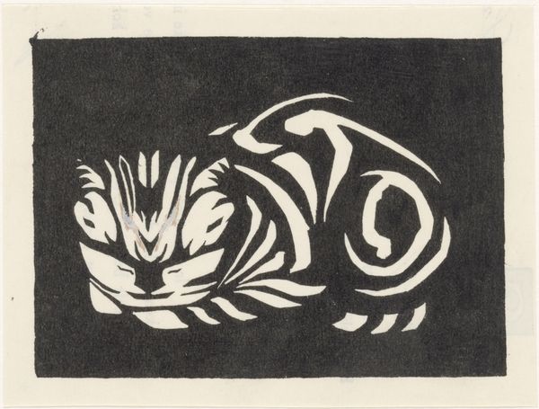 Curator: Here at the Rijksmuseum, we have a striking linocut entitled "Schildpad," or "Tortoise," by Julie de Graag. Its creation is dated sometime between 1887 and 1924. Editor: It’s incredibly graphic. The high contrast makes the tortoise feel both monumental and surprisingly vulnerable, nestled in that almost lunar, soft white oval. It strikes me as ancient, iconic. Curator: The process itself is fascinating. Think of the physical act of carving into linoleum to create this image, removing material to define the shape of the tortoise, the negative space becoming almost as important as the subject itself. A very deliberate, labour-intensive method for what appears, at first glance, so simple. Editor: Exactly. The tortoise itself carries such weight – from ancient creation myths to Aesop's fables. That shell becomes this powerful symbol of protection, wisdom, longevity. And yet, here it's presented with this almost naive directness. There is something about the patterns that suggest ancient inscriptions. Curator: And let’s consider the choice of linocut itself, a readily available and affordable medium in the early 20th century. De Graag is consciously working within a particular set of material conditions. It democratizes printmaking, in a way. Her style incorporates that same kind of utilitarian access as the medium. Editor: Perhaps, too, it reflects a broader cultural interest in the tortoise as a symbol of constancy in a rapidly changing world. There is something grounding and primal about it, its form enduring throughout millennia and cultures. Curator: Considering the accessibility of this piece given its materials and creation, I wonder about its production value as it reflects artistic integrity beyond profit. Editor: Seeing this today really draws out all those layers. It prompts reflection about the weight of the past and our own individual journeys toward longevity. Curator: It really allows one to meditate on De Graag's unique position in history through these humble materials. Editor: Precisely; I can certainly appreciate Schildpad anew.