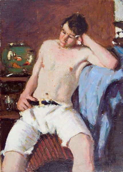 Curator: Denman Waldo Ross’s “Seated Young Man in White Shorts,” presents a quietly arresting image. The work is about 35 by 25 centimeters and can be found here at the Harvard Art Museums. Editor: The first thing that strikes me is the contrast—the almost luminous skin against the shadowed interior, bisected horizontally by that bright band of sea and sky. Curator: Indeed, the composition leads us to a tension between the subject's exposed physicality and the implied intimacy of the interior space, prompting questions about the relationship between viewer and sitter. Editor: I'm intrigued by the brushwork, notice how the visible strokes seem to almost sculpt the form, imbuing it with a tangible presence. The color palette is muted, yet purposeful. Curator: And in its moment, perhaps this painting spoke to the rising popularity of leisure and outdoor activities among young men, subtly reflecting shifting social norms around masculinity and display. Editor: Ultimately, it’s a study in light and form that invites a deeper consideration of representation and viewership.