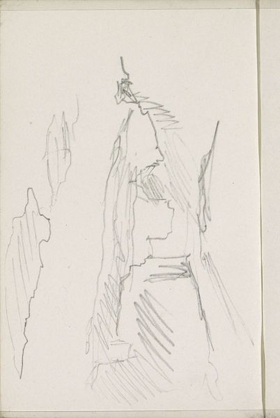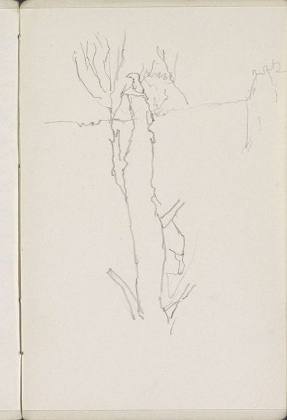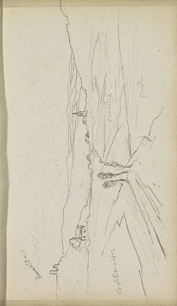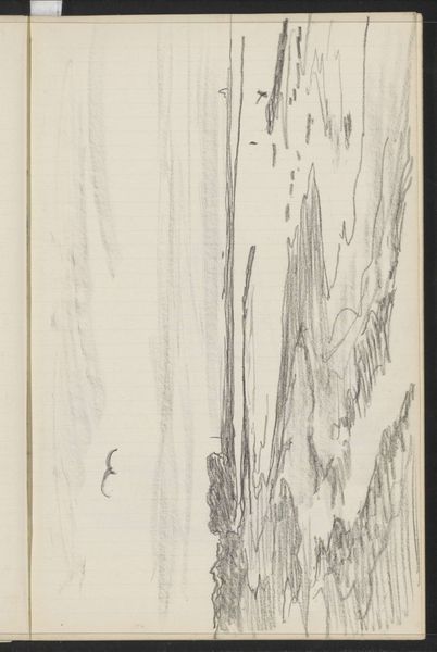 Curator: Alright, let's dive into this intriguing sketch, shall we? What do you think? It's a drawing by Cornelis Vreedenburgh, aptly named "Landschap," created around 1935 to 1936. It's currently residing at the Rijksmuseum. Editor: My first thought? It's like glimpsing a thought, a fleeting impression rather than a concrete place. Sparse and almost fragile. What medium did he use? Curator: It's pencil on paper, really highlighting the immediacy. The linear quality brings form and abstraction together, wouldn't you agree? Editor: Precisely! Look at the recurring vertical strokes and the ambiguous shapes on the right. Are these trees? Cliffs? The formal repetition creates a spatial rhythm but resists definitive readings. It invites semiotic freefall, really. Curator: Absolutely, and I believe it evokes the sense of movement—you know how artists sometimes capture something just before it settles into what we call real, ordinary... This, for me, feels like capturing pure potential. Editor: Well, the incomplete, sketchy nature is characteristic of a personal sketchbook aesthetic. It’s less about finished form and more about capturing essential structural relations: how lines imply edges, how minimal shading suggests volume. Curator: Agreed. The incompleteness gives us a window into Vreedenburgh's process; he’s mapping out what a landscape *could* be. And personally, the monochrome adds to the contemplative feel, wouldn't you say? It is a landscape stripped to its essence. Editor: Yes, the restricted palette concentrates our attention on the stark contrasts between line and empty space, solid form, and potential form. It becomes a study of elements—almost platonic in its focus on the fundamental components of representation. Curator: Right? Like he’s isolating a core idea. Okay, that's making my brain all happy and warm. I like how he wasn't precious about defining everything! The magic's in the suggestion... Thanks! Editor: A lovely exploration of reduction. A journey toward clarity. Thanks to you as well!