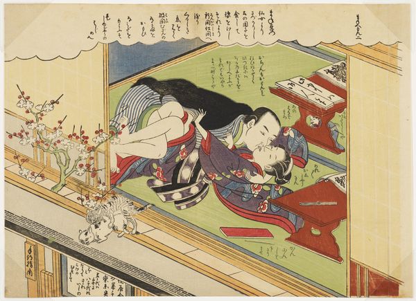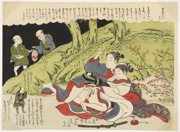 A couple entwined while listening to a blind shamisen player at the Ikaho hot spring in Kozuke Province, at right Mane'emon dries his head after emerging from the bath.