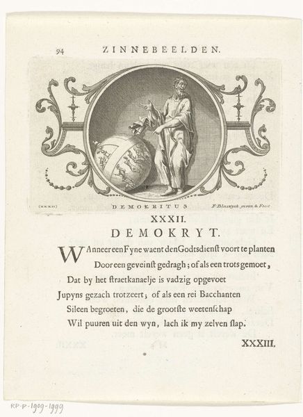 Curator: I'm struck by the melancholic mood in this engraving, "Emblem with the philosopher Heraclitus." It’s all in the lines, the etching of a world-weary expression. Editor: Yes, the baroque era certainly loved its allegories of sorrow. What you're responding to, I think, is part of a well-worn visual trope—François van Bleyswijck produced this somewhere between 1681 and 1737. These "emblems," as they were called, were very much a product of their time, functioning as little moral lessons. Curator: Little? He looks ready to burst into tears next to that globe! It's not just sorrow though. It's seeing through the facade, seeing how "truth crawls along the ground," as the text below puts it. Heavy stuff, made delicate by the line work. Editor: The inscription is definitely key. Bleyswijck’s work participates in a much wider system of representation. He presents a familiar, almost stock figure and a poetic description designed to evoke contemplation on grand themes like truth, justice, and… well, despair, I suppose. It really does seem a bit overwrought to modern eyes. Curator: Maybe we need a good dose of overwrought these days! Everything’s so cynical. What if he’s not world-weary, but world-hopeful, weeping at the potential, the fragile balance represented by that globe? Perhaps he's got allergies! Editor: Haha, I like the allergies theory. That is certainly a much kinder reading, considering this work hangs in the Rijksmuseum, hopefully offering some visitors a moment to reflect upon themselves and society. Curator: Indeed. Perhaps to pause, see a piece of our own reflections. You never know which bit of historical expression might set off our heart’s string and bring some truth.