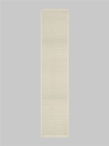 Editor: Here we have Chris Lebeau's textile, "Wandbespanning," created between 1911 and 1915. The repeating patterns have a rather soothing, almost meditative quality to me. How do you interpret this work, considering its time and the imagery? Curator: Indeed. Notice the verticality, the way the patterns ascend like growing things. For me, the repeated motifs suggest an aspiration towards nature, typical of the Art Nouveau, but with a restrained hand. It reminds me of ancient Egyptian art, particularly the lotus and papyrus motifs used in columns and friezes. What emotional associations might these historical symbols evoke in a viewer of the time, do you think? Editor: A connection to nature and maybe a sense of timeless beauty? Curator: Precisely. The subtle repetition almost works as a type of cultural echo, reminding us of these enduring images across millennia, adapted into a contemporary design for interior spaces. There’s a connection here between domesticity, art, and a sense of cultural memory. Do you think that relationship stands true today? Editor: That’s a good point. The connection is more subtle these days, isn't it? It's almost hidden within the layers of symbolism. I learned a lot about symbols as cultural artifacts and cultural memory. Curator: Excellent! We all did!
