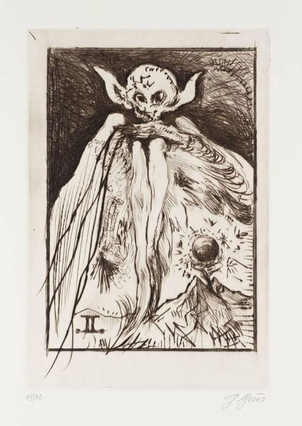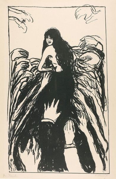 Editor: Here we have Edvard Munch’s "The Ragman (The Wanderer)," a stark woodcut made between 1908 and 1909. The intense contrast and angular lines create a feeling of isolation, of being trapped, almost claustrophobic, even though it depicts a figure in a landscape. What can you tell me about this print? Curator: What I see here is a potent statement about the marginalized figure, reflecting the social anxieties of Munch's time, but also resonating today. We must consider who is often rendered invisible, forced to the fringes. The rough woodcut medium amplifies the sense of alienation. It denies us the soft edges and comforts of illusion. Look at how the vertical lines almost cage the figure, reinforcing that feeling you described. Do you see a parallel with contemporary discussions around displacement and social exclusion? Editor: Absolutely. It's hard not to think about those struggling on the margins, even today. The figure’s weathered appearance and heavy burden drive that home. It almost feels prophetic. But what about the figures in the background? Curator: Ah, the spectral figures. Munch often uses figures to explore relationships, to speak to emotional connections. But who are they here? Are they merely witnesses or symbols of the internal struggles plaguing our central figure? Are they allies, or do they also exclude this lone individual? Editor: It's unsettling, that ambiguity. So it is open to interpretations, both on social issues as well as individual ones? Curator: Precisely. Munch invites us to consider how societal structures intersect with individual experience, particularly the experience of the 'outsider.' The "Ragman" becomes a mirror reflecting our own responsibilities towards those pushed to the edges of society. Editor: That’s a powerful lens to view it through. It encourages reflection on our role in creating a more inclusive space. I never thought about a Munch this way before! Curator: Art challenges us; it disrupts and it allows us to feel as well as consider change, even now.