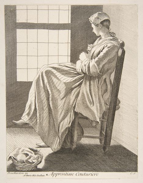 Editor: This is Jacques Philippe Le Bas's 1754 engraving, "The Thrifty Woman," residing at the Met. There's a quiet, almost domestic feeling, yet something about the woman’s intense focus on her writing pulls me in. What symbolic language do you see at play in this seemingly simple scene? Curator: The power of symbols is truly fascinating here! Note the quill and inkwell. They speak not merely of literacy, but of a controlled narrative. She’s documenting, accounting—perhaps controlling her own story in a patriarchal society. Notice the provisioned basket—a clear sign of a home manager. Is this simply a domestic scene or is something deeper implied about who holds power? Editor: I see what you mean. The basket and bundles initially made me think of domesticity, but considering her focus, it suggests agency and resource management, a silent strength maybe? Curator: Precisely. And consider what 'thrift' meant in 18th century France. Not merely frugality, but also wisdom, good stewardship. Think of this composition as a window into how the burgeoning middle class saw themselves. A counter narrative to courtly extravagance, grounded and capable. Editor: So the symbolism serves almost as a form of cultural aspiration, showing how one ought to live? Curator: Indeed. Each item, from the window—illumination and the external world—to the carefully itemized bundles suggests order and intentionality. These resonate deeply with that era's values. Even today, these can elicit deep feelings. Editor: It is astonishing how many meanings are packed in one quiet domestic scene. I have a newfound appreciation for what these images communicate about its society. Curator: Absolutely. And, it reinforces how crucial it is for viewers to unravel and contextualize a symbol, bridging eras. It adds nuance and meaning!
