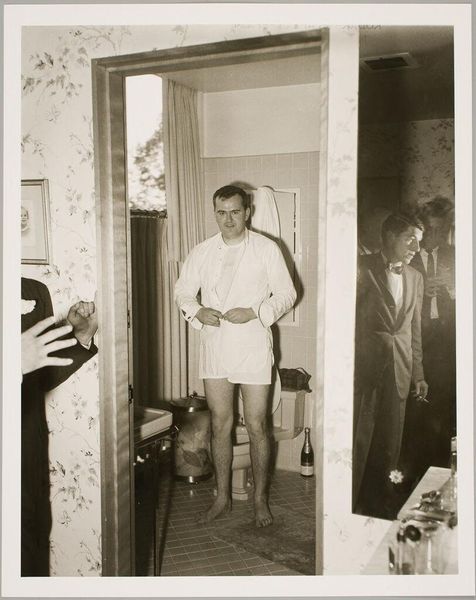 Editor: This is an untitled photograph by Bill Dane. It looks like a candid shot of two people, one inside and one outside a window with some beer cans in the foreground. What's your take on this work? Curator: Notice how the framing emphasizes the window itself. Dane invites us to consider the very means of image production and distribution, drawing attention to the materiality of photography and its role in shaping our perception of reality. What labor went into producing the materials in this image? Editor: That's a good point! It makes me think about the mass production of these beer cans. Thank you for pointing that out! Curator: And what about the social context that produced these figures, or the lamp above them? Considering these relations offers a whole other reading.