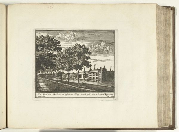 Curator: This engraving by Jan van Call, dating back to approximately 1700, presents the Oranjerie at Park Sorghvliet in The Hague. What’s your first take? Editor: It's so orderly. The layout, the rows of trees… it screams control. I'm curious what level of manual labor would be required to keep all those elements so rigidly shaped. Curator: Order indeed, it embodies the Baroque era's fascination with classical ideals, reflecting a controlled landscape symbolizing human dominion over nature. The very idea of an Oranjerie suggests this: a place to cultivate exotic plants, emblems of worldly power and access. Editor: It strikes me that even the process of engraving – cutting lines into a metal plate – mimics the regimentation on display. Someone meticulously etching these symmetrical designs by hand... think of the hours! The very material of the print embodies that need for control and imposed order. Curator: The sharp lines and meticulous detail amplify the cultural importance of the space. The presence of figures in the foreground, leisurely strolling, offers a narrative – portraying a lifestyle afforded by wealth and power. The orangery transforms into a status symbol. Editor: Absolutely, and the print medium makes that symbol reproducible. This image wasn’t just for the owner of the Oranjerie; it's for circulation, a dissemination of their status through the sheer mechanics of its production. A commodity, ultimately, reflecting a culture of consumption and display. Curator: Perhaps the artist aimed to capture an aspirational space, designed for more than botanical appreciation, and intended as a showcase of cultural and societal power. Editor: Right. From the controlled landscape to the controlled labor and manufacturing that represents it, we can understand the period’s intense need to classify and shape everything into a specific aesthetic, and beyond that, a distinct class structure. Curator: It highlights how art, even a seemingly simple landscape print, can speak volumes about the culture that produced it. Editor: And reminds us that even images rooted in pleasure have material and societal costs attached.